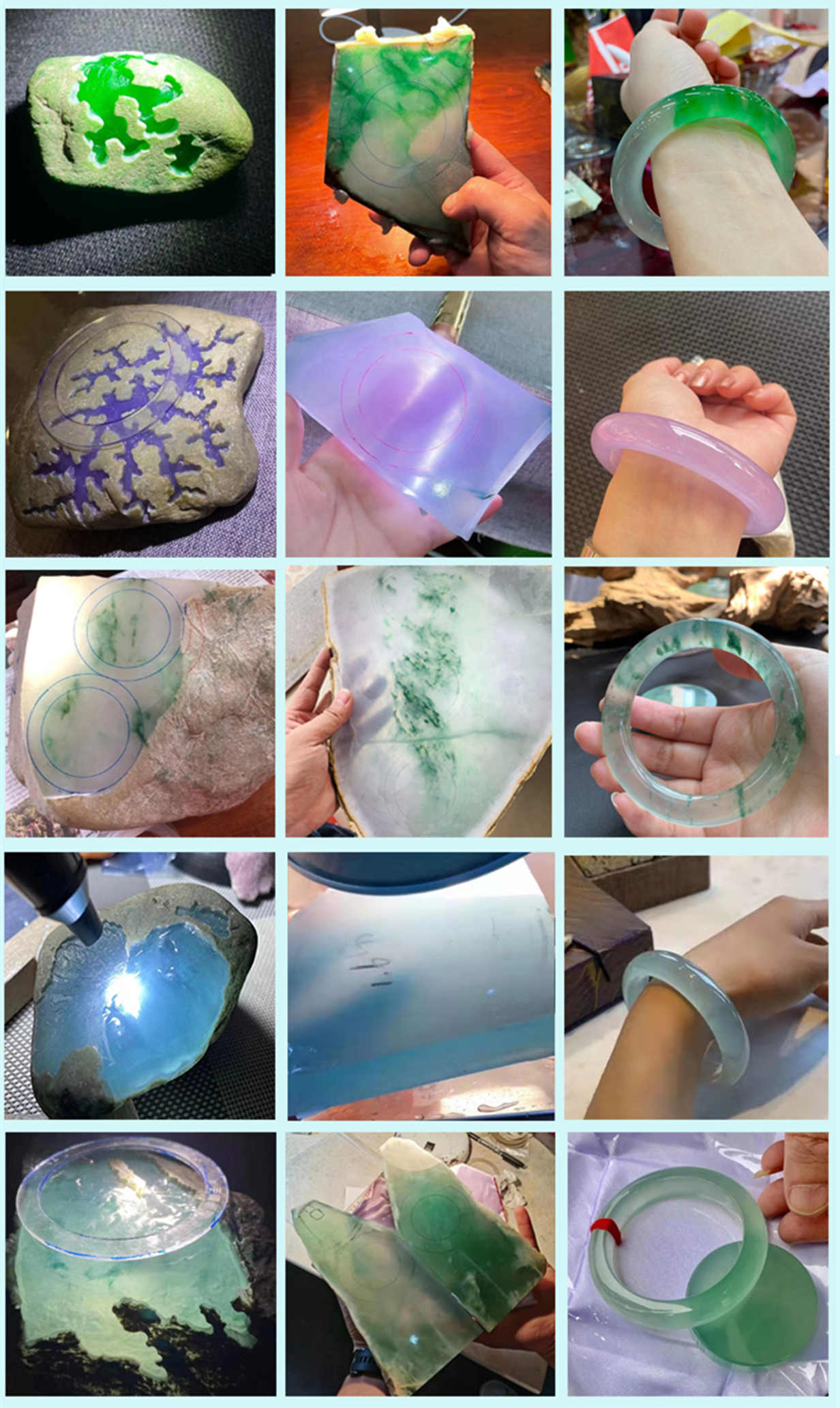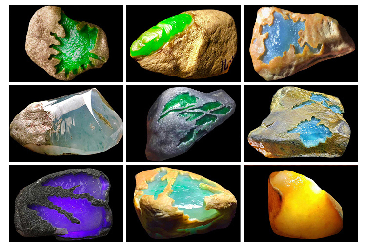 翡翠原石切開後顏色千變萬化,綠色更是數不勝數,玉是獨一無二的,一模一樣的都非常的少。有:陽綠、艷綠、翠綠、秧苗綠、蔥心綠、癭哥綠、藍水綠、菠菜綠、江水綠、瓜皮綠、油綠、油青。